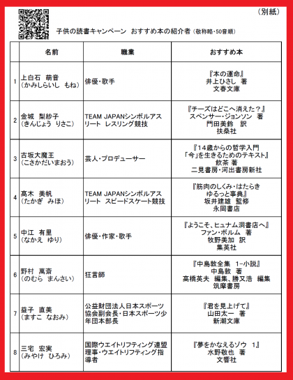 「子供の中でも、特に高校生は、読書離れの傾向がみられています。部活動や勉強等の様々なことに日々向き合う中高生等が様々な本に触れ、読書に親しめる機会が増えるよう、教育、科学技術・学術、文化、スポーツの各分野で御活躍の方々によるおすすめの本とメッセージを御紹介する読書キャンペーンを実施します。