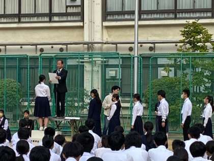 まずは、賞状伝達。「大阪市立中学校総合文化祭」において、美術部の皆さんが「ポスター原画の部」で、理科の自由研究が「科学理科部門」で、そして、女子バレーボール部が第3ブロックA地区3位の表彰と、たくさんの賞状伝達がありました。