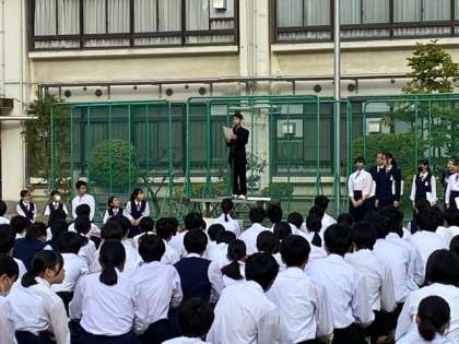 校長先生からは「1年を締め括る時期が来ました。今週は、1年生は延期になった合唱コンクール、2年生は職場体験、3年生は茶道・華道体験が予定されています。コロナ禍でしばらく行われなかった行事が復活して実施されます。貴重な経験を積んで。豊かな心を育みましょう。そのためにも、くれぐれも健康に留意して過ごしましょう!!」とお話がありました。