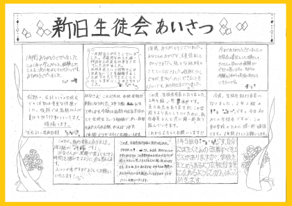 裏面には「新旧生徒会あいさつ」が掲載されています。旧役員の皆さん、1年間ありがとうございました。生徒会役員の経験を今後の生活に役立ててください。新役員の皆さんは、東中のリーダーとして1年間どうぞよろしくお願いします。