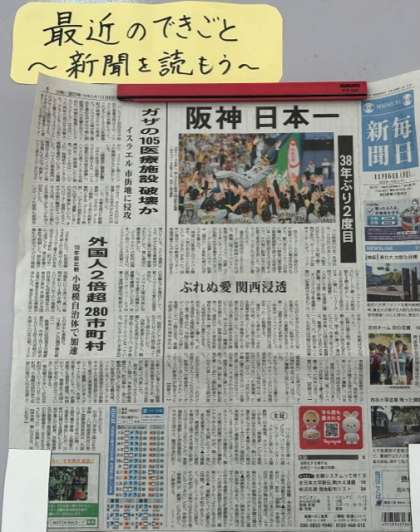4階の廊下には「新聞を読もう」と新聞がたくさん掲示されています。