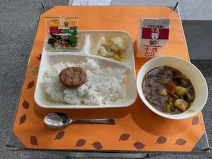 本日の献立は「ハンバーグカレーライス・カリフラワーのピクルス・豆こんぶ」です。熱々のカレーに、お口の中をやけどしないようにしましょう。