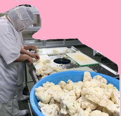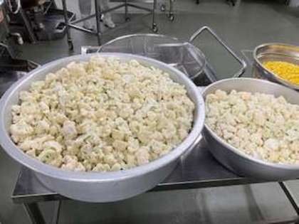 本日提供されているカリフラワーは、冷凍モノではなく、生のものを使用しています。毎日、約1200人分の給食を調理している『東中給食室』では、調理員の皆さんが、この1200人分のカリフラワーを手作業で切って、調理していただいています。