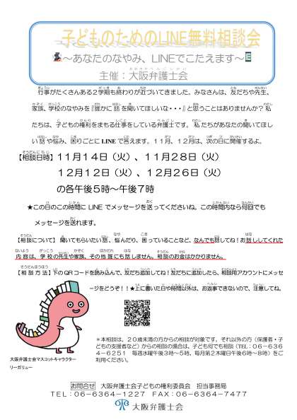 大阪弁護士会人権課から、案内がありました。つらい思いをしている人は、利用してみてください。みなさんの元気な姿、明るい笑顔がたくさんみられますように。