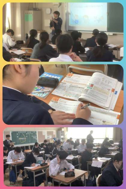 写真は、3年生の保健と社会、わかくさ学級の様子です。生徒たちは、期末テストに向けて、集中して授業を受けていました。