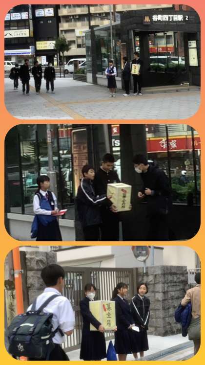生徒会役員のメンバーが、今朝も、赤い羽根共同募金の活動に取り組んでいます。東中生のみならず、通行中の方からも募金をいただけます。ありがとうございます。なお、この活動は11月17日(金)まで行います。