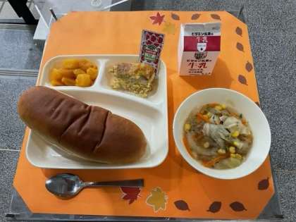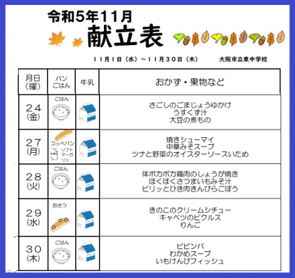 さて、来週は期末テストで、給食はひと休み。次は24日(金)です。エプロンなどは洗濯して、テスト後に忘れないように持参してください。11月の献立は写真の通りです。しっかりと給食をいただいて、感染症にかからない健康を維持しましょう。