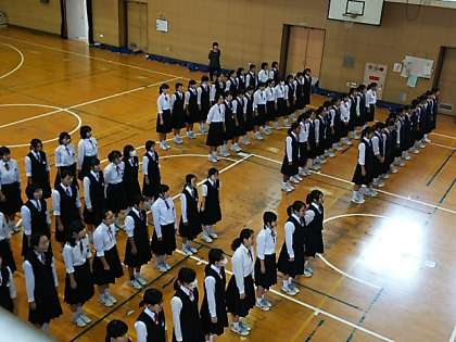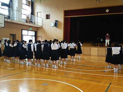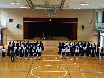 今月末に行われる文化発表会では各学年の合唱コンクールが行われますが、今日から本格的に練習が始まりました。この時間は女子の練習を体育館で、男子の練習を教室で行っています。