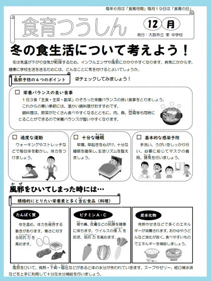 「食育つうしん」では、「冬の食生活について考えよう!」の見出しで、「風邪予防の4つのポイント」として「栄養バランスの良い食事」「適度な運動」「十分な睡眠」「基本的な感染予防」についての記事が掲載されています。