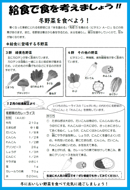 裏面の「給食で食を考えましょう!!」では、「冬野菜を食べよう!」の見出しで「給食に登場する冬野菜」が紹介されています。ぜひご一読ください。