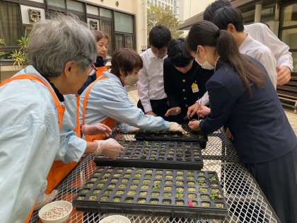 今日は、秋の種花事業のため、中央区役所市民協働課の方々と地域のボランティアの方々がお越しになりました。発芽したデイジーやジニアの花を植え替えしています。
