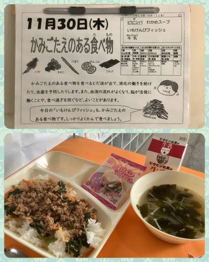 本日の給食は、年に2回のビビンバ、わかめのスープ、いもけんぴフィッシュ、牛乳です。しっかりいただいて、寒さに負けない健康を維持しましょう。