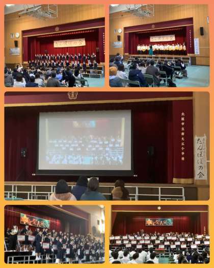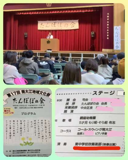 第17回南大江地域文化祭「たんぽぽの会」が南大江小学校で開催されています。ステージではたんぽぽの会の会長さまと中央区長のご挨拶、銅座幼稚園の園児の歌唱、地域の合唱団のコーラスに続いて、吹奏楽部の文化発表会時の演奏映像が上映されました。校庭では「南大江ドリームカーニバル」が開催され、小学生に混じって、楽しそうに過ごしている中学生の姿もありました。