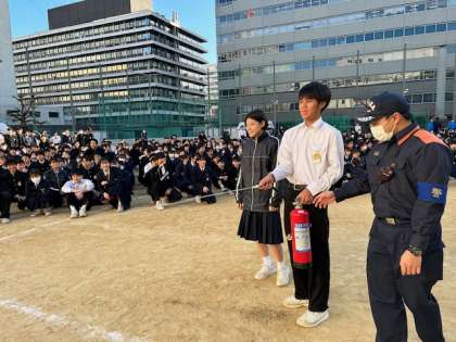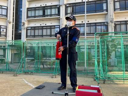 また、消火器訓練では代表生徒が「ぴん、ぽん、ぱん」の手順で訓練を行いました。