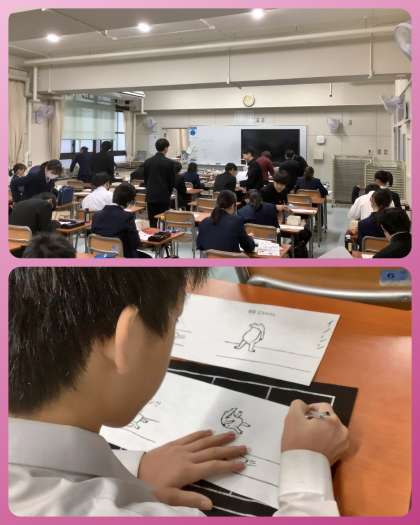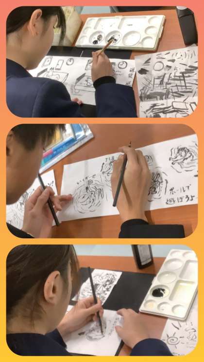 2年生の美術の授業では「墨に触れよう」(絵画)に取り組んでいます。墨の特性を生かして、自分なりに創意工夫して作品に表現しています。4コマ漫画風に仕上がっている作品は、思わず「クスッ」と笑顔になります。
