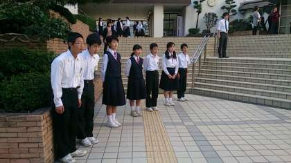 爽やかな朝、東中生が登校しています。新生徒会役員が、初めてのあいさつ運動に取り組んでいます。