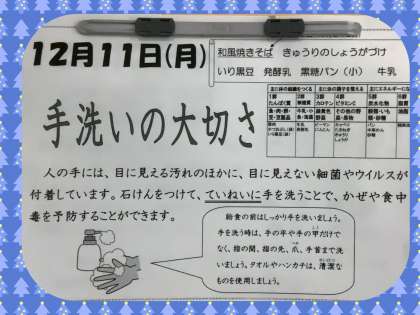 インフルエンザなどの感染症が、まだまだ流行しています。しっかり手洗いしてから、給食をいただきましょう!