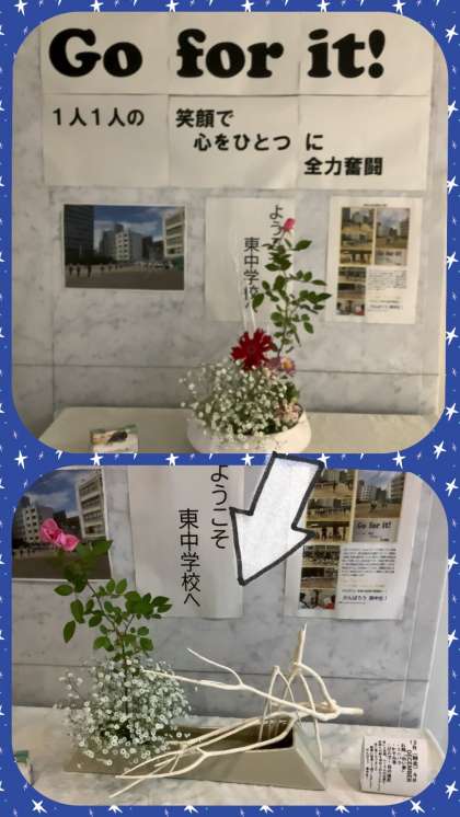 先週、生け替えていただいたばかりのお花の花器とアレンジを、昨日変えていただきました。ありがとうございます。東中生の皆さん、変化に気づきましたか?