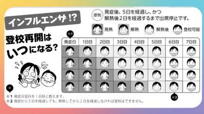 なお、発症した日をゼロ日目とし、5日間は出席をお控えください。例えば、本日発症した場合は、12月12日(火)がゼロ日目ですから最短でも12月17日(日)までが出席停止期間です。次の登校は12月18日(月)です。この期間は、登校とともに外出を控えるなど、拡大防止にご協力ください。また、自宅で療養に努めましょう。