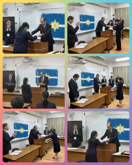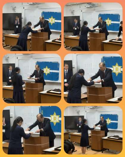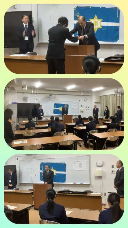 東税務署長さまはじめ、東納税貯蓄組合連合会(東納税協会)等の関係の皆さまにお越しいただき、令和5年度中学生の「税についての作文」表彰式を行っていただき、ご講評とともに激励のお言葉をいただきました。ありがとうございました。