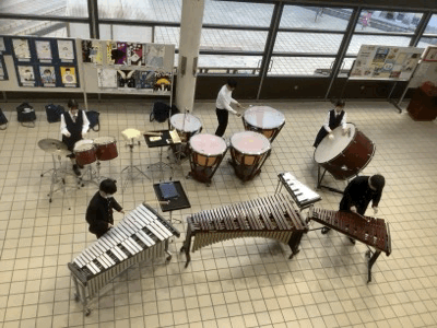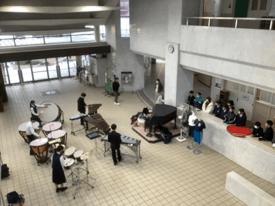 吹奏楽部が、夕方の本番に向けて、新校舎の多目的室で最後の練習。その後、玄関ホールでは、トラックに楽器を運ぶまでのスキマ時間に即興の壮行会演奏。たくさんのギャラリーに囲まれて、本番さながらに息の合った演奏を披露しました。素晴らしい!!