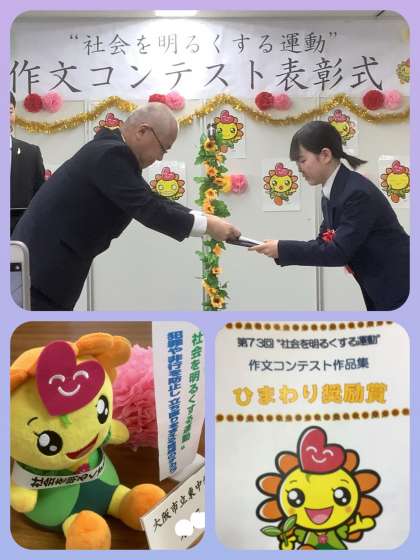 本校2年生が、第73回「社会を明るくする運動」作文コンテストにおいて、大阪府下14000遍以上の作文からの3作品に選ばれ、「ひまわり奨励賞」の表彰を受けました。素晴らしい!!