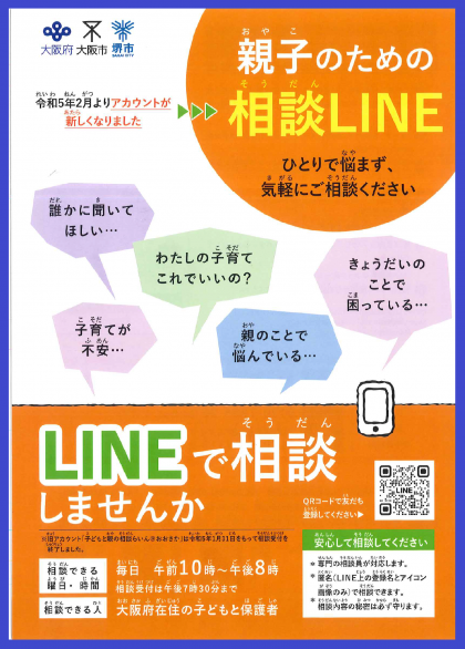 もし、何か困っていることがあれば、これまでもお知らせしている「相談窓口」や、「親子のための相談LINE」などを活用してください。誰かに話す・伝えることで、重荷を放してください。