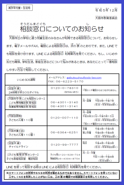 大阪市立の学校に通う児童・生徒のみなさんが利用できる相談窓口について、お知らせします。電子メールや FAX、電話による相談窓口は、「相談窓口についてのお知らせ」のとおりです。また、LINEでも相談を受け付けています。「LINEによる相談窓口利用案内」をご覧ください。もし、いじめや友だち関係、学校生活、家庭生活などについて悩みがあるときは、あなたにとって一番相談しやすい方法で相談してください。