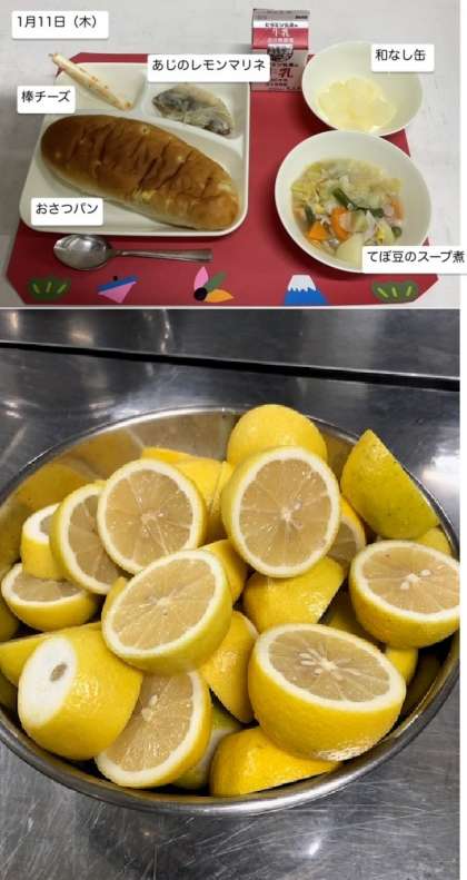 今日の給食には、新鮮なレモンが使われ、料理の味を引き立てます。しっかりいただきましょう。