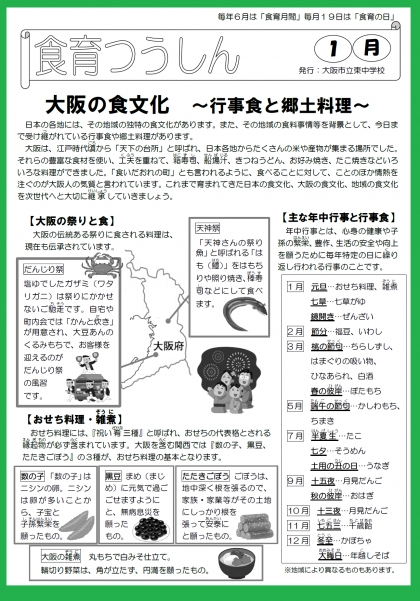 「1月の「食育つうしん」では、「大阪の食文化 〜行事食と郷土料理〜」のタイトルで、東中校区にゆかりのある話題が掲載されています。一部抜粋します。