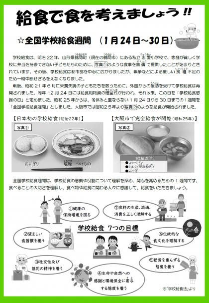 また、裏面のでは、「全国学校給食週間(1月24日〜30日)の記事や、「学校給食7つの目標」が掲載されています。ご一読ください。