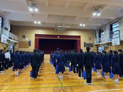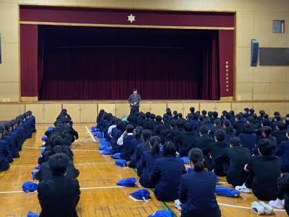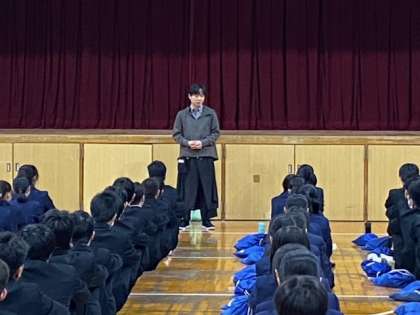 3学期最初の学年集会をしました。今日は音楽科でICT担当の先生からのお話でした。