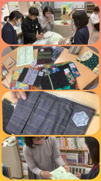 続いて、来室した1年生は、カウンターで「貸出100冊達成しました!」。(拍手)すると、元気アップの皆さんが手作りで用意している校章入りブックカバーが、記念品としてずらい登場。かなり迷いましたが、1つを大事そうに手にしました。まだ、1年生です。また、次の素敵なブックカバーをゲットしましょう!!