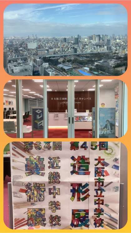 第45回大阪市立中学校造形展・第64回近畿中学校美術展が、大阪芸術大学スカイキャンパスで行われています。場所はあべのハルカス24階のキャンパスフロア。期日は、1月21日(日)までで、時間は11時から17時(入館は16時30分まで)です。この週末、本校生徒の作品のみならず、大阪市立の各中学校より選ばれた個性あふれる作品、そして、近畿一円から集まってきた秀作をぜひご鑑賞ください。(案内状はこちらをクリックするとご覧いただけます。)