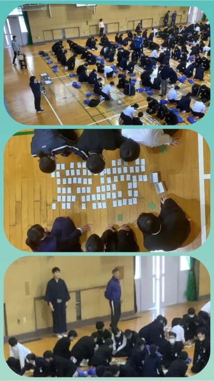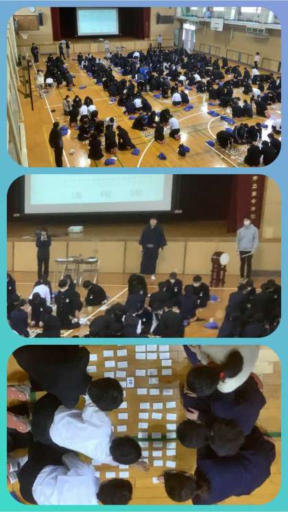 1年生の百人一首大会が、5・6時間目に体育館で行われました。進行の先生が和服で登場。読み手には、先生に混じって元気アップのコーディネーターの皆さんが登場。大会の進行・運営にご協力いただきました。ありがとうございました。