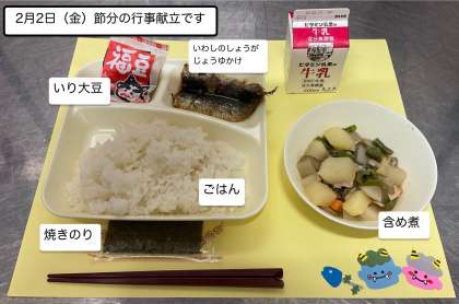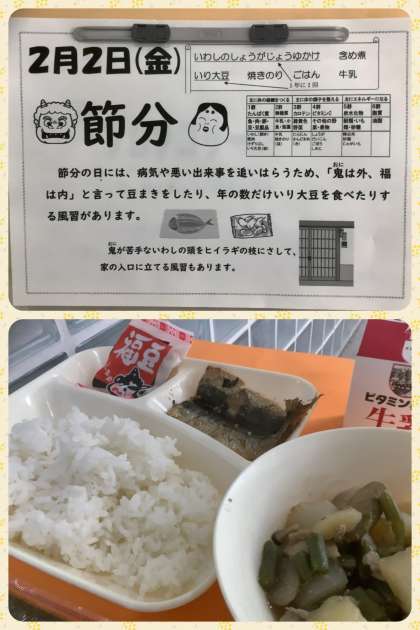 明日が節分、明後日が立春。暦は春に向かっていますが、まだまだ寒い日が続きます。三寒四温を繰り返して、春の到来です。献立に込められている思いや願いを受け止め、給食をしっかりいただいて、心の中の鬼(邪気)を追い払い、心も身体も健康な生活を送りましょう!
