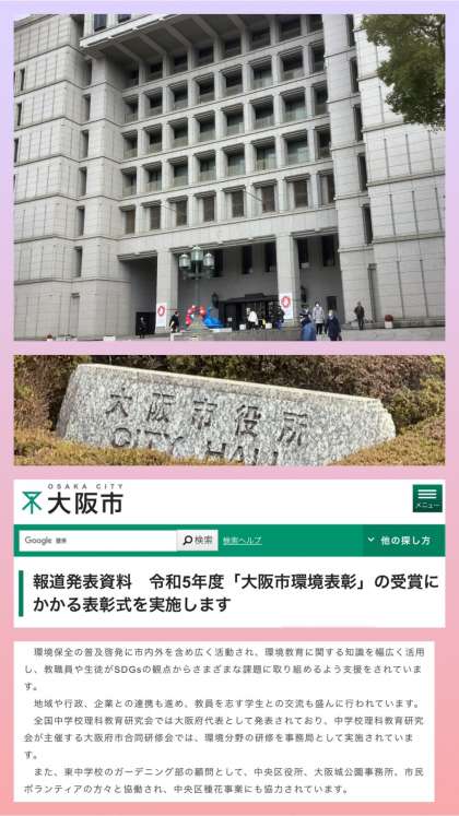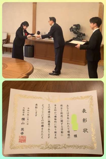 本校の先生が、大阪市環境表彰を受賞されました。おめでとうございます。学生時代から環境に興味を持ち続けられ、教員になってからも各方面で活躍されています。本校では、理科の授業を通して、また、ガーデニング部の活動などを通して、環境についての取り組みを続けて来られました。おめでとうございます!
