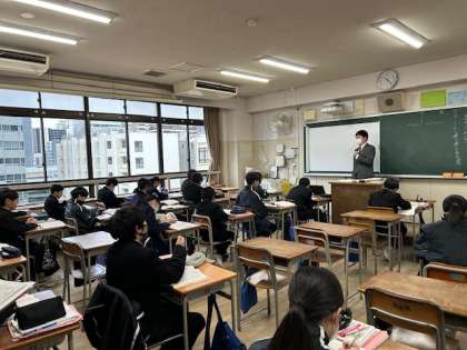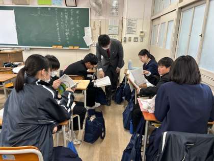 アドバイザーの先生に来ていただいて研究授業です。ヘルマンヘッセの「少年の日の思い出」を学習しています。グループで話し合い意見を交流していました。