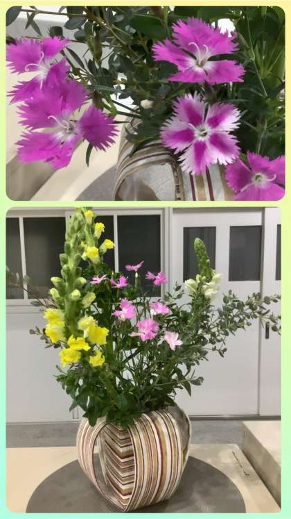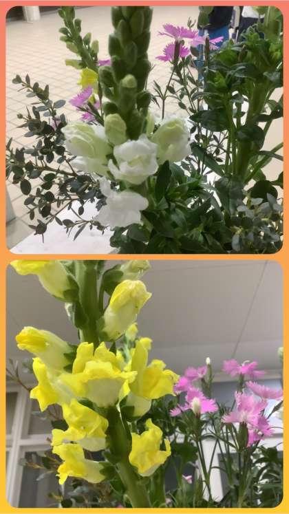 玄関ホールと職員室前のお花を生け替えていただきました。玄関ホールには「金魚草・なでしこ・ユーロり」、職員室前には「ガーベラ・ゴッド」の草花です。いつも東中生のためにありがとうございます。