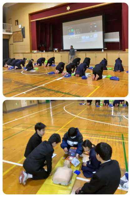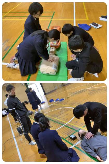 2年生は保健の授業で心肺蘇生法の実習を行いました。見るのとするのとは大違い、2分間の心臓マッサージが終わった途端に、あまりのしんどさに大の字に寝転んでしまいました。