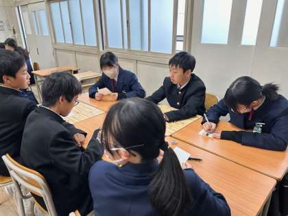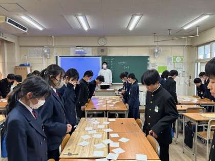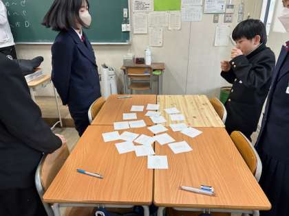 先生の発音に耳を傾けて、カードに書いていきます。そして、班の中でカードをとりあいます。