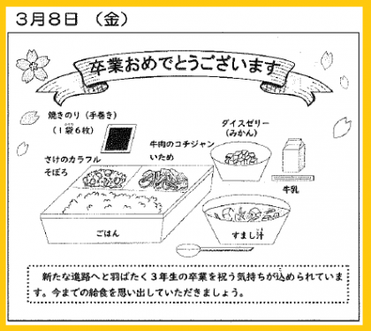 3月8日(金)には、『卒業お祝い献立』として「手巻きご飯(牛肉のコチジャン炒め、さけのカラフルそぼろ)・すまし汁・ダイスゼリー(みかん)」が提供されます。お楽しみにしてください。