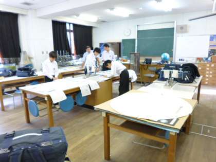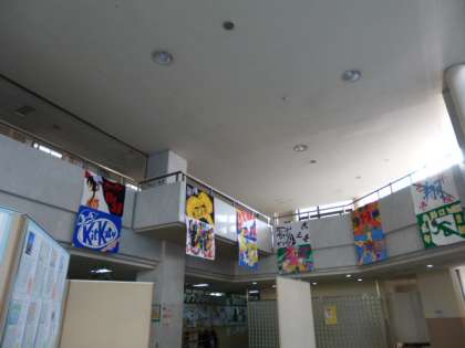 第1理科室の様子です。また、玄関ホールには体育大会の学級旗も展示してあります。