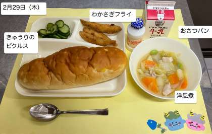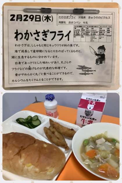 本日の給食にワカサギのフライが提供されます。あさつパンやアツアツの「洋風煮」などと一緒に、しっかりいただきましょう!