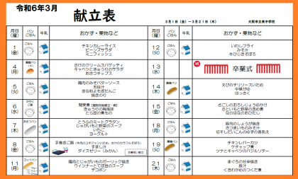 明日から3月ですね。3月の献立表を掲載します。こちらをクリックするとご覧いただけます。