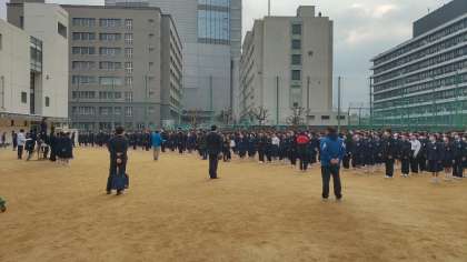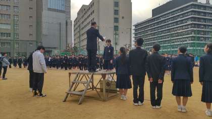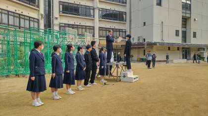 今日の全校集会は外で行いました。外での集会は、災害避難時の集会体形でもあるため定期的に行うのですが、今回は寒い時期にはオンラインでの集会を行っていましたので、久しぶりの外での集会になりました。