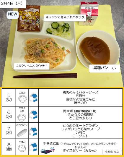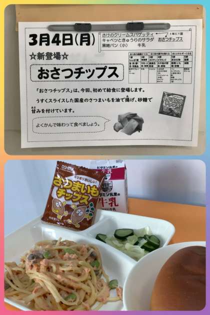 本日の給食は、「鮭のクリームスパゲティ」が登場します。また、『おさつチップス』が、給食初登場!!栄養教諭の先生方が中心となり、メニューの工夫改善に取り組んでいただいています。ありがとうございます。