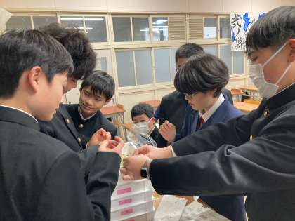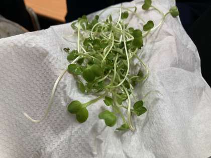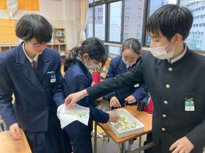 室内で育てた「カイワレ大根」を収穫しました。気温が低く発芽しなかったのを、暖房の効いた教室で育てたことで、成功しました。