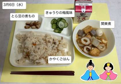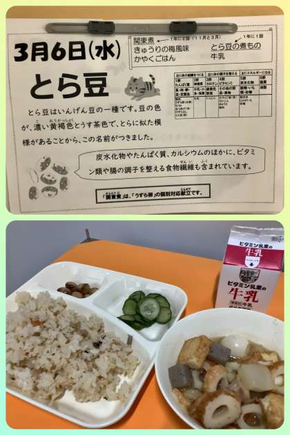 本日の給食には、かやくごはんと関東煮、1年に一度ののとら豆の煮ものが提供されます。雨も止み、寒さが少し緩みましたが、給食をしっかりとゆっくり噛んでいただいて、健康の保持増進に努めましょう。