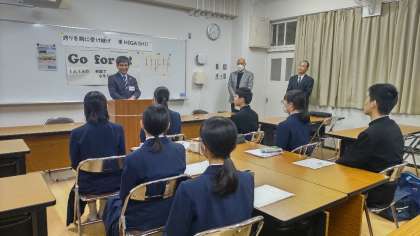 区長さんからは、生徒会長への表彰状伝達のあとに「未来にエール」として、様々な史跡や素晴らしい環境に囲まれ、文化の香り豊かな中央区で育ったことを誇りに思い、これからも頑張ってください、と暖かい応援メッセージをいただき、最後はみんなでにっこり記念撮影を行いました。